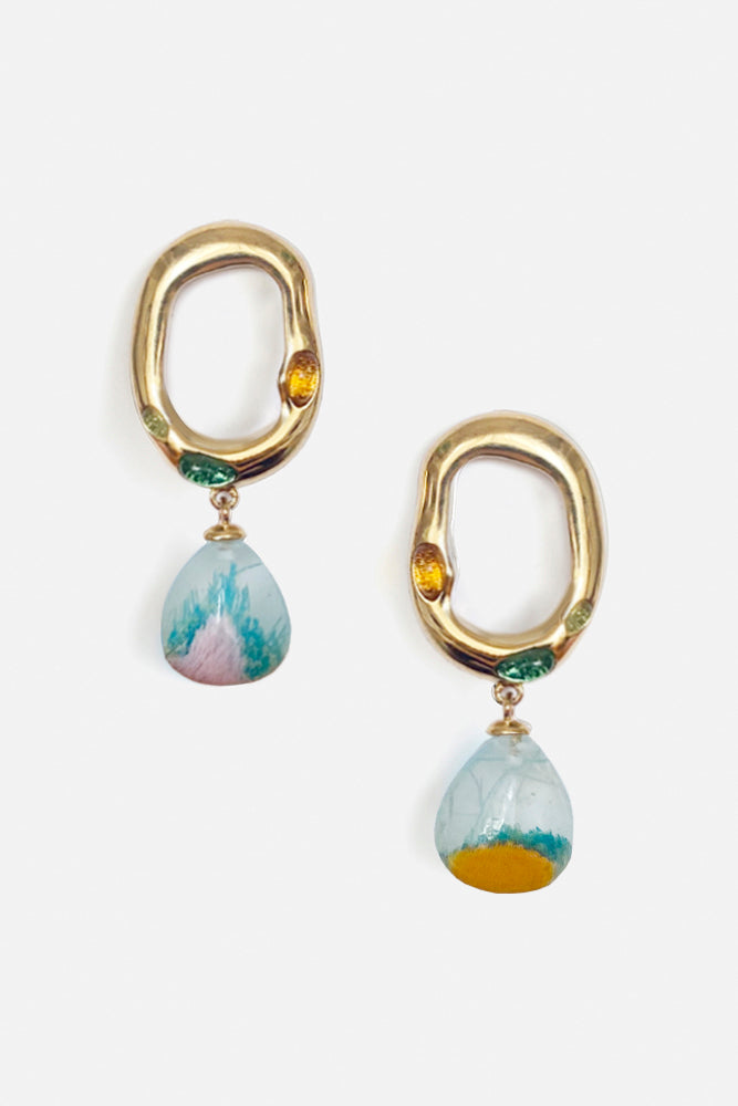 Pelagos Earrings are unique in its organically hollow-like shape. Handmade in plated metal and set with different coloured glass beads, this unusual shape punctuates the delicate coloured resin drop to add just the right amount of balance.