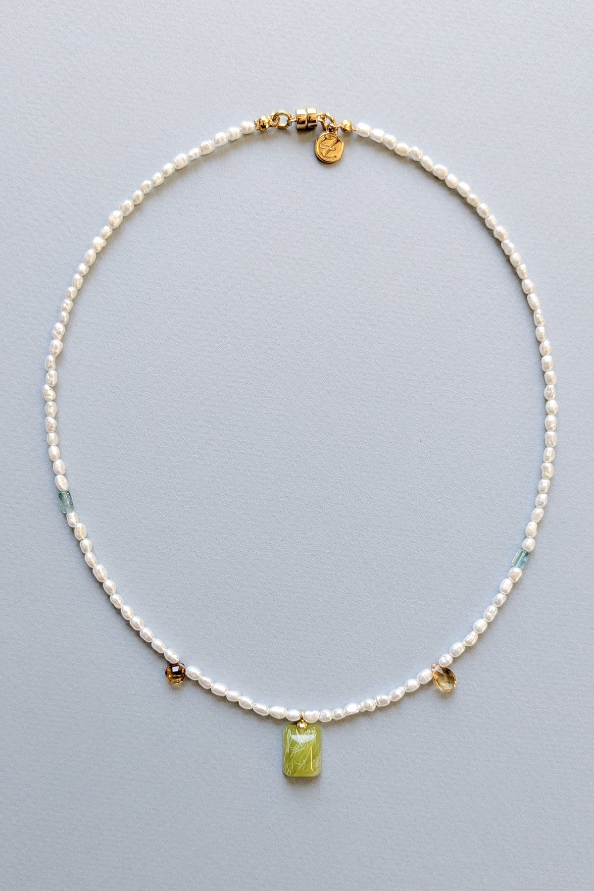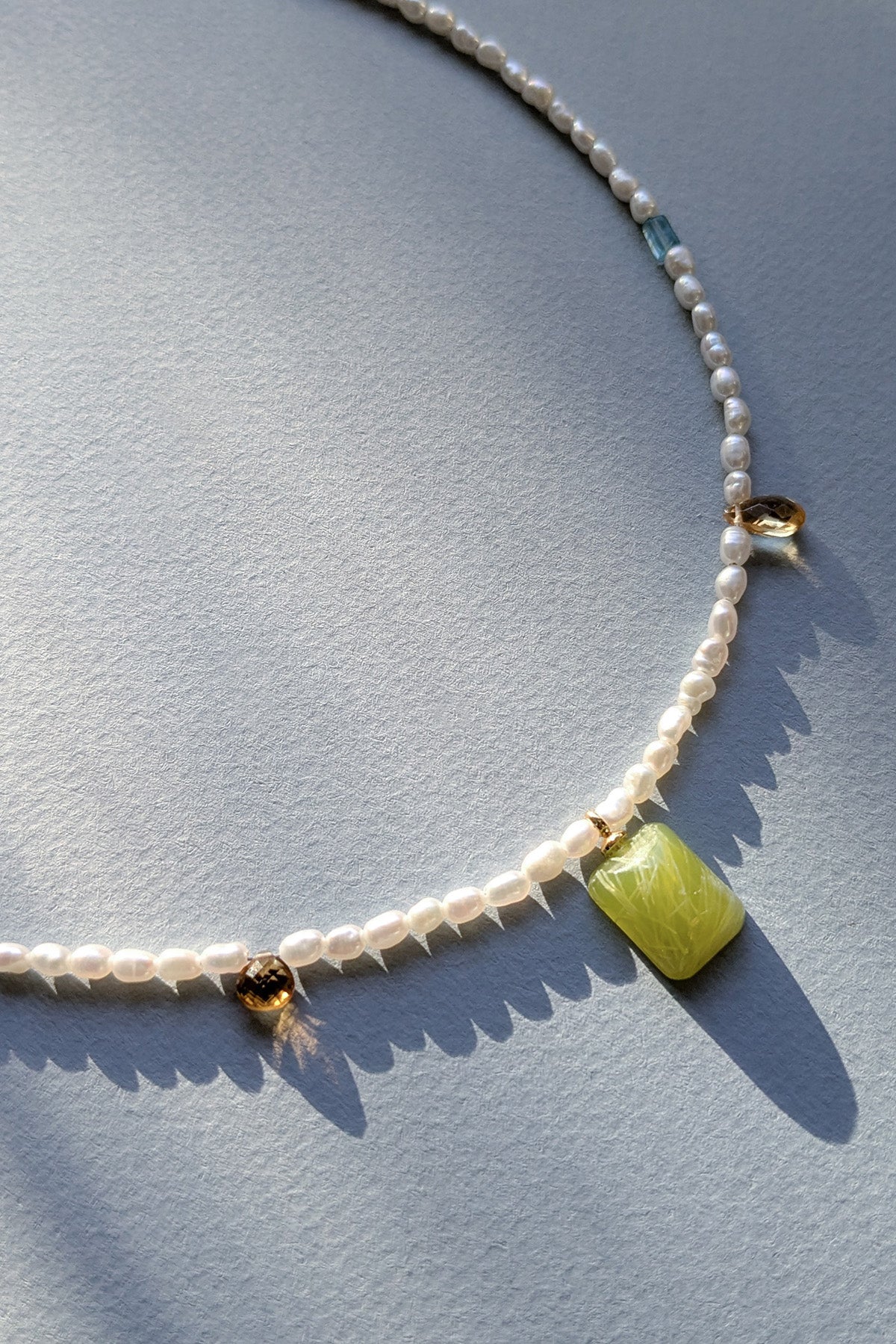 The Honeydew Pendant Necklace combines yellow citrine and aquamarine accents with freshwater pearls for a refreshing, golden glow. Its resin pendant adds a playful, modern twist. Miniature and easy to layer, it’s a bright, uplifting piece designed to catch winter light and bring a soft sweetness to everyday wear.
